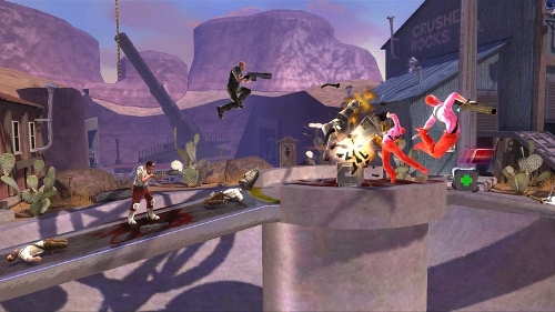 Oddly enough, this opening bit of dialogue also seems to follow the general flow of the game. The premise for each level is either a nod or a direct reference to some movie, TV show, or video game; the backgrounds and settings pull from video games both modern and old; and there are at least a few points in each level that make you think “this is absolutely ridiculous,” but not in a good way. The game play is about what you’d expect for a 2D shooter, i.e., you run, gun, jump, duck, and huck some grenades, with the somewhat added feature/annoyance that you can shoot enemies in the background and vice versa, ala Shadow Complex. Enemies occasionally drop different weapons, such as a shotgun, machine gun, laser, and flamethrower, and if you rack up enough dead bodies before becoming one yourself, you can activate “Hazard Time,” which makes your character invulnerable and increases your firepower for a limited period of time. With a second player in tow, not much changes in the game except that you now have two guys running around causing mayhem and destruction instead of one. In a nice little throwback move, if your buddy should run out of lives, he can always steal one from you to ensure that the fight lasts at least a little bit longer.
