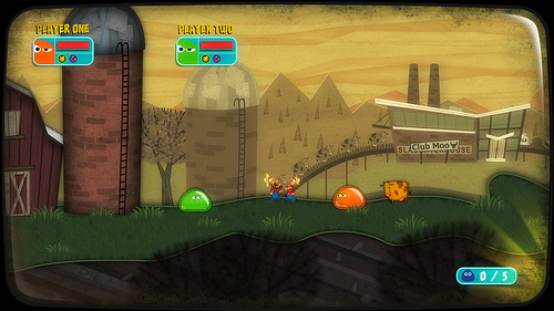 In Tales from Space: About a Blob, two players can play simultaneously and interact by climbing or jumping off one another. Although the goal is for the blobs to work together, players can choose to attack or push each other around if they want, and can compete to see which player is better at destroying the world. Around the office, people usually ping-pong back and forth between working together to solve puzzles, then messing each other up near obstacles or enemies.