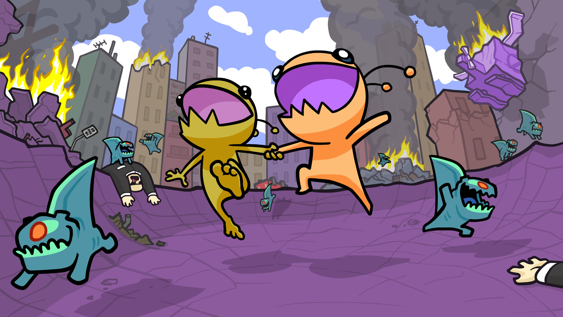 Alien Hominid Invasion is a spin-off that teams up to four local or online players up in horde mode-like 2D stages. The team will have to complete various objectives while they blast away at never-ending armies of human and robotic bad guys. After completing enough objectives, players race to the extraction point in order to complete the level. After clearing several stages, players will stop at a hideout where they can bank the loot they've found so far and purchase new equipment. Fail a level before then, and you won't get to keep the new stuff you picked up! It's a fun and challenging game structure that encourages replay and cooperation.