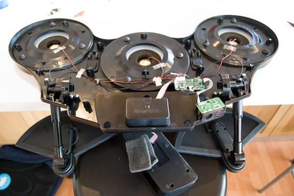Actually, it wasn't too bad. There were two circuit boards, and maybe a dozen or so wires, attached to the drum heads with a white goo, and secured by tape to the case itself. Immediately, I saw the problem: the black wire attached to the red drum head had snapped off above the white gluey stuff. (I'm sure that's the technical term.) I sent my oldest fellow warrior to the armory to fetch a weapon: my wire stripping tool. Five minutes, a few well placed strips of tape, and a visit to freestyle mode for testing later, and the battle-hardened trio were back on the front lines, with the red pad working perfectly once again.