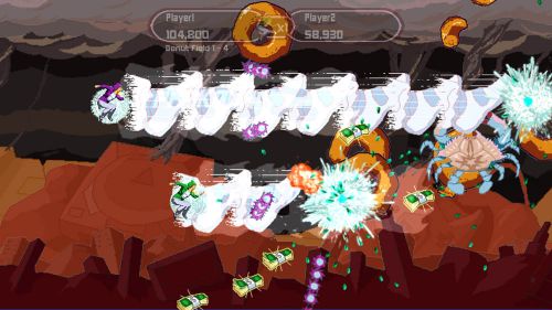 Once you get into the game you play as Parkour Girl, a reference to the idiotic graphic chosen for the "Game Type" block on the dashboard - your avenue for finding the Xbox Live Indie games. Parkour Girl can shoot and parkour kick the crap out of enemies in a side scrolling shooter. Who do you fight? Well none other than members of those annoying ads like donuts, football players and crabs. At any time a second player can join in as a pink parkour girl and take on the action.