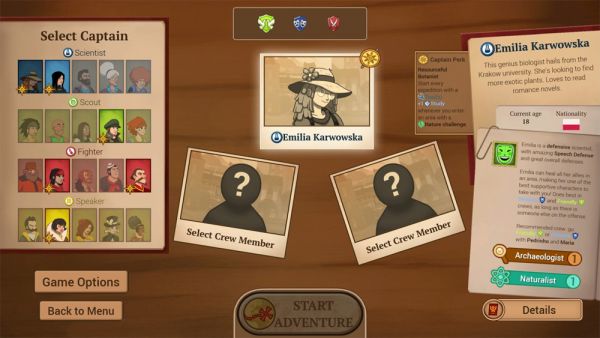 Renowned Explorers (henceforth RE) is an adventure-style, turn-based rogue-like. There are two modes: Adventure Mode and Discover Mode. Adventure Mode only saves when players close the game and the game is generally more difficult (making it a true rogue-like). Discover Mode provides a more casual options, allowing players to save whenever they want and get to new locations faster. After picking a mode, players assembled a party of three characters (a leader and two followers) from a list of 4 classes (speaker, fighter, scout, and scientist). There are 5 characters in each class to pick from, but at the beginning of the game players can only pick from 4 leaders total (1 for each class). As they play the game, though, they will be able to unlock more leader options (after completing 2-4 expeditions with followers, they can become leaders of later expeditions). Besides achievements, this is the only persistent progression I’ve found in the game after parties are defeated.