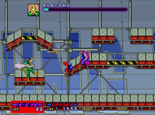 Each of the characters has the standard punching and jumping moves, plus, by pressing both attack and jump together, the use of a special ability unique to the character. Spider-Man, naturally, uses his web shooters, while Black Cat uses her whip to slash enemies. Hawkeye's arrows make sense as a special attack, but Namor... Namor shoots electricity, a power he has only rarely exhibited in the comics. It's nitpicky, for sure, but just serves to underscore how odd it was to include Namor in Spider-Man the Video Game.