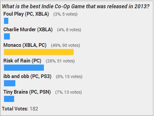 The way we picked the list of games the community could vote on this year was driven by the staff. Basically there were 20 slots for games. 20 possible choices to be on the list. Each staff member nominated two games and those got put on the total list of possible games for the year. The end result for both AAA and Indie were less than ten games each. It's obvious there were fewer memorable co-op experiences this year than previous.
