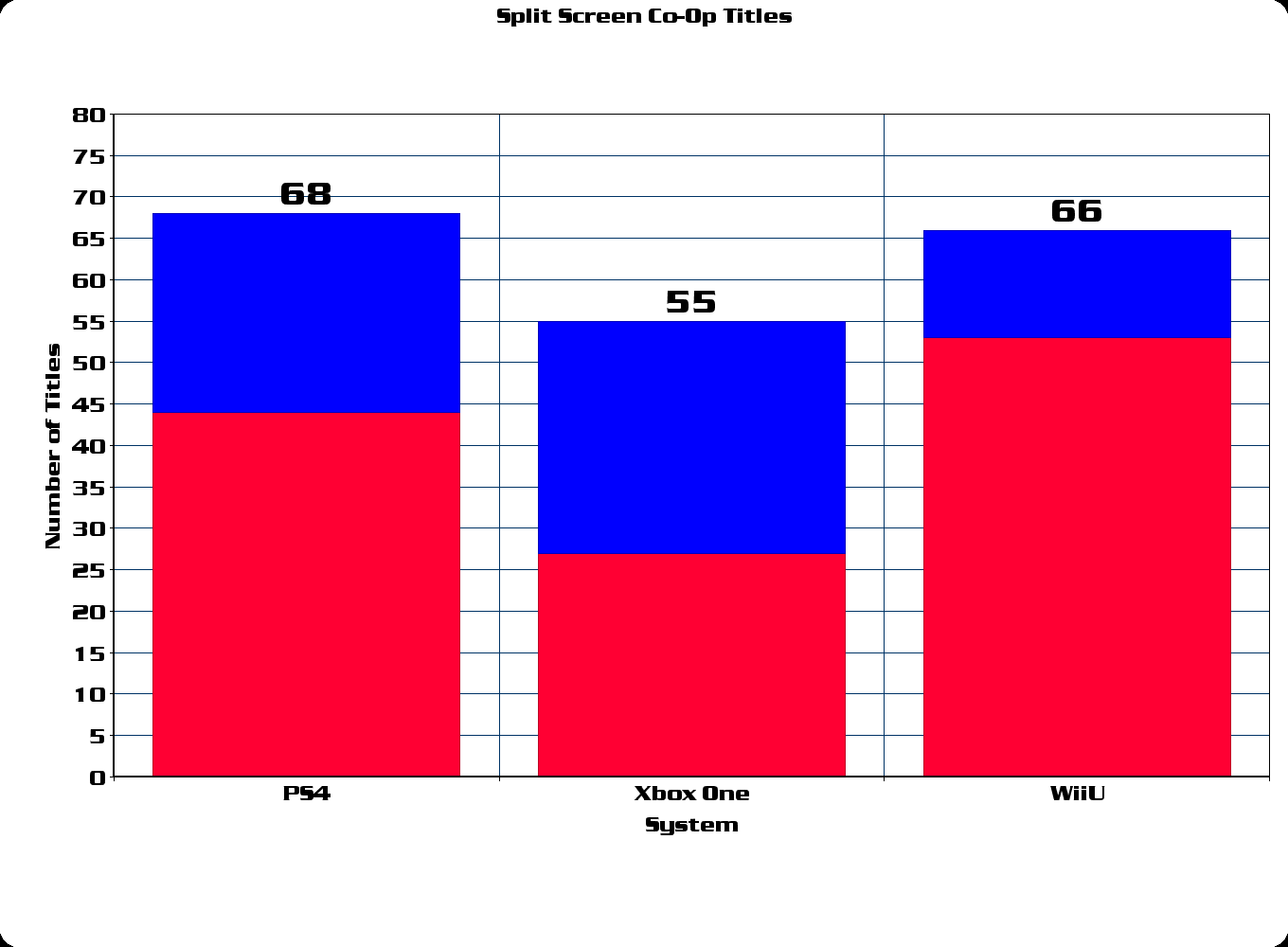 Local or couch co-op, where multiple players can enjoy a game together on the same screen, seems to be overlooked more and more these days, as a quick look at our co-op games database can determine. Using the Xbox 360 as a baseline, of the 377 co-op games in the Co-Optimus database, 270 of them included couch co-op, a healthy 72% of the total. Check out this graph showing the data for the next generation of video game systems. Local co-op games are in red, other co-op games in blue.