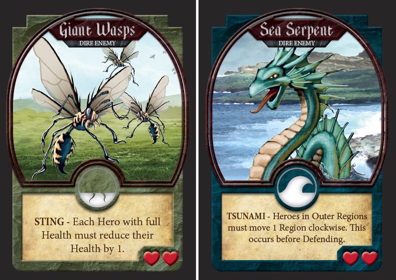 Dire enemies are even more difficult to defend against. Like standard enemies, dire enemies show up in the same location each round, which is helpful for planning. Unfortunately, it takes two health points to defend against a dire foe. Additionally, dire foes have unique abilities that make things harder on the players if they are not defended against. The sea serpent, for example, causes a tidal wave which sends players to adjacent regions. These terrible events make things even harder for the players, and can throw a wrench in the works of even the best conceived plans.