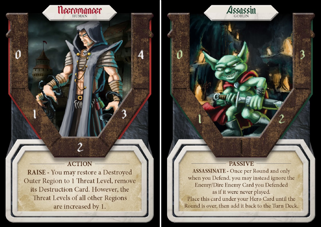 The theme in Tiny Epic Defenders is rich. While it draws upon the standard fantasy archetypes in many ways, there are plenty of unique components. There is a large set of heroes available, and the abilities that each one has are interesting and make sense thematically. The oracle can look at the turn deck in order to see the future, the barbarian can trade life for actions, and the ranger is effective at range. The enemies act as you would expect they would, too; monstrous fish creatures attack the coast, while skeletal legions arise to threaten the ruins. The artwork on the cards is evocative of early Dungeons & Dragons illustrations, which adds to the feel of a fantastic realm under the threat of evil and the varied heroes willing to defend it.