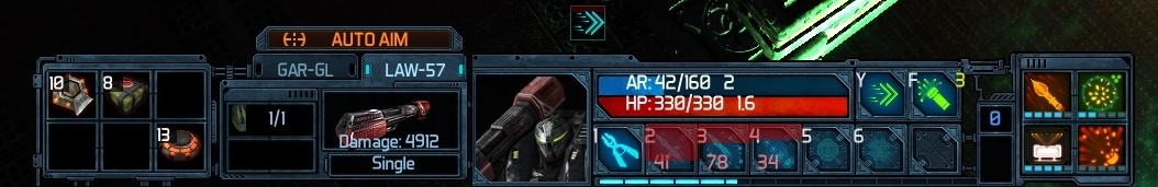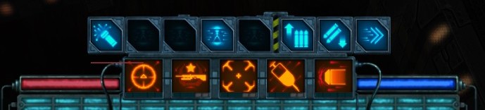 We had big problems finding the right UI for The Red Solstice because of the new mechanic we introduced (component-skills system). Since in The Red Solstice you can level up or level down a component to gain certain skills, you have to show both choices to the player. Our first UI iteration looked like this.