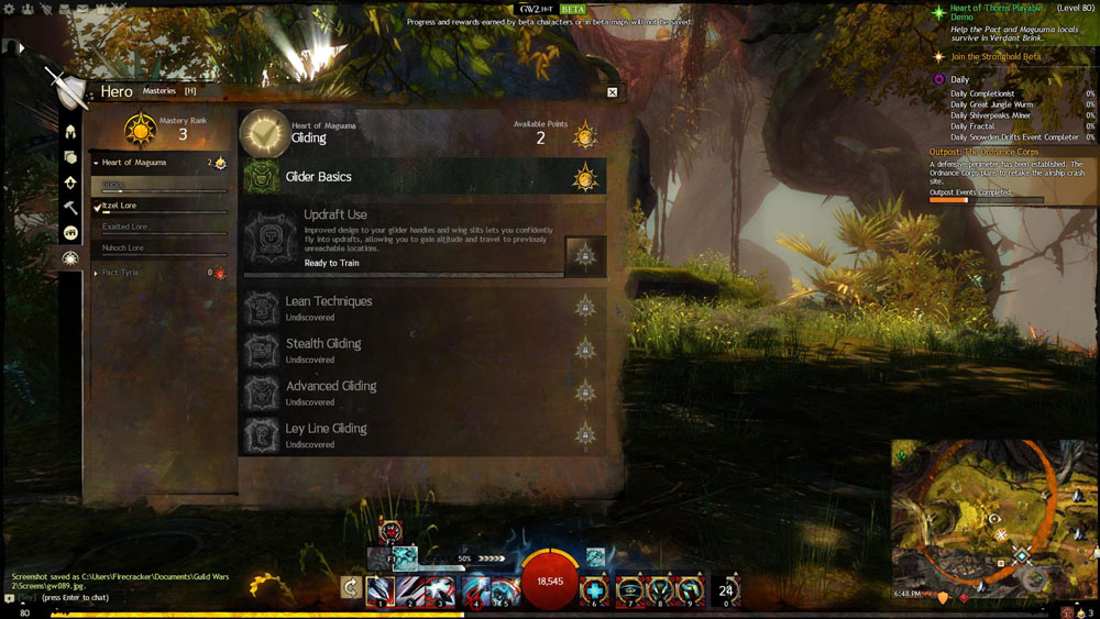 As I mentioned before, more of the Maguuma Jungle was unlocked this weekend to explore. To get to most of it, though, I needed to unlock some of the Mastery skills. Now we come to my biggest complaint about the weekend: unlocking the masteries. Players must pick a mastery line they are currently “training.” This just means they toggle a mastery skill that they want to gain XP for. For me, I needed to learn Glider Basics. In order to allocate a mastery point, players must train (i.e. get enough XP) a mastery skill to the point where they can learn it. This is done by the normal means of getting XP for a character (e.g. killing monsters, doing events, progressing the private story).