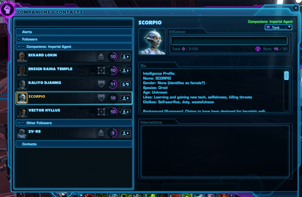 Moving on to general changes and upgrades, the two biggest game-wide system changes since I last played are the Discipline system and the Companion overhaul. Previously, after players picked their Advanced Class for their character at level 10, they gained access to three talent trees specific to their Advanced Class. They would distribute their talent points across their trees, unlocking further skills or passive abilities. As the years have gone on, many MMOs have moved away from this type of system and SWTOR is no exception. Talent trees have been replaced with Disciplines. Each Advanced Class has three Disciplines to choose from (which seem to very roughly correlate to the three talent trees in the previous iteration of the specialization system). Rather than distributing talent points, Discipline-specific skills and passives are unlocked at certain level milestones. You can change your Discipline at your faction’s Fleet if you find you don’t like the one you chose.
