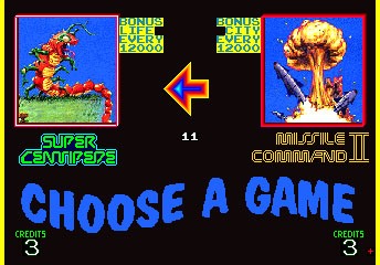 As you can see from the screenshots, both Super Centipede and Missile Command II allowed a second player to join in. For the first time, you and a friend could team up to take down incoming missiles or runaway arthropods. This would have made a huge difference in the difficulty of both games, adding to the playtime per quarter, I would imagine, unless the speed of the game were increased and more frequent enemy appearances were tweaked to accommodate the extra player. Unfortunately, most people never had the chance to try either of the two new games included in Arcade Classics, either with a friend, or alone. According to the data at the Killer List of Video Games, Atari made only a handful of cabinets, and the game never made it to mass production. I've been unable to find too much information about Arcade Classics, but as a fan of co-op coin-op, I certainly wish this game was more widely available. A two trackball cabinet based on fondly remembered classic games like Centipede and Missile Command would have been quite unique compared to the sea of Street Fighter clones so widespread in arcades in 1992.