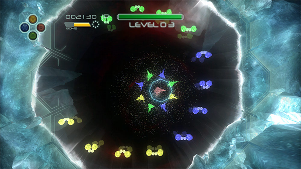 To be fair, Octagon isn’t actually a twin-stick shooter. One stick controls your ship’s movement and firing direction, the other stick doesn’t do anything at all. Firing bullets is, instead, relegated to the face buttons. The reason for this shift is that the enemy ships you face in Octagon are only vulnerable to attacks from like-colored bullets, i.e., red ships can only be defeated by shooting them with red bullets, which are fired by pressing the B button on the 360 gamepad. Firing single bullets isn’t your only option, however, as holding down one of the fire buttons creates a charged blast of the corresponding color. This souped up color bullet will actually bounce around the game field (which is appropriately shaped like an octagon) for a bit before it dissipates, wiping out any enemy ships that get in its way. Best of all, taking out ships in this fashion starts a combo chain, which is responsible for charging up your bomb meter so you can unleash a screen clearing attack at just the right moment.