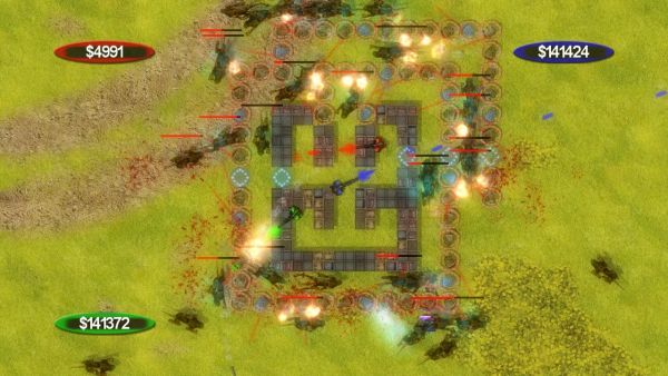 Two different game modes are available: Defense, where a central hub of some sort must be maintained at all costs, or Survival, where the only objective is to avoid a grisly death at the claws of the attackers. Waves of lizards spawn from all over the edges of the screen, and at first, your only option is to shoot them with your gun. As you fight, money is earned, which can be spent on walls and one of three different types of towers. Rockets and Lasers are the meat of the defensive forces, while Ice towers slow down the onslaught. Force fields are scattered around the map, and allow humans to pass while blocking the alien critters.