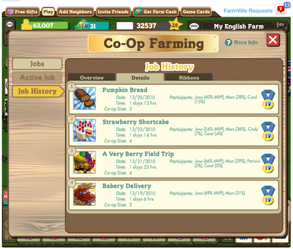 At long last, I reached level 20. Now, I could participate in a co-op. These worked like special orders, where two or more FarmVille players raised certain crops in order to meet a quota in a given time. Peanut butter and jelly sandwiches were one early co-op job. I raised the strawberries, my mother the peanuts, and other mafioso.. er... "friends" handled the wheat for the bread. Like a well oiled machine, we raised the proper ingredients in plenty of time, and scored coins and valuable fuel for our efforts