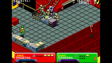 Two more types of levels served to spice up the experience. The first were the vehicle-based stages, where the two heroes guided a small spacecraft through a maze of canals, attempting to make it through before time expired. These levels were brief, but exciting. The boss levels, where the square-jawed duo took on Reptilons or giant robotic creations, all but required players to use up their supply of bombs in order to conserve lives. Once the boss baddie dropped, it was on to the next factory, to collect more humans to send back home. The last boss fight was particularly brutal, limiting the players to one life, no matter how many credits they plunked in. Yeah, this was frustrating, but kinda cool, at the same time.