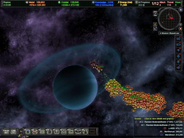 Christopher: The thing to remember with this game is that the primary way that I play it is co-op. So all of the behaviorlets, as well as all of the gameplay mechanics in general, were designed with co-op play in mind. If it didn't work well in co-op, it got cut from the game. And some of the AI types, such as Bully and Assassin for instance, really only make sense in a co-op context, because they go for the weakest and strongest players respectively, and in a solo game that doesn't have any meaning. I think this may be one fundamental difference between myself and a lot of other game designers -- I'm not just a proponent of co-op, I'm not just tacking it on because intellectually I believe it's a good idea, but rather this is the primary way that I play games whenever they support it. 75% or more of our alpha testing was done while playing co-op, and I'm not sure there's another game around that could say that! I don't feel like co-op is the number one selling factor for AI War in the general marketplace, since most genre fans play solo, but I built this primarily for my playgroup and myself, so co-op has always been at the very forefront when it comes to design.