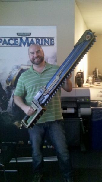 The day was capped off with a multiplayer tournament. Whoever won got to take home a replica Chainsword. Yep, that's me holding it. Nope, I didn't win it. The victor was decided by kill totals after three matches. I knew I was screwed after the first match, where I only got six kills. In the second match I earned 10. I followed that up with 16, giving me 32 total. The winner had 48. Congratulations.