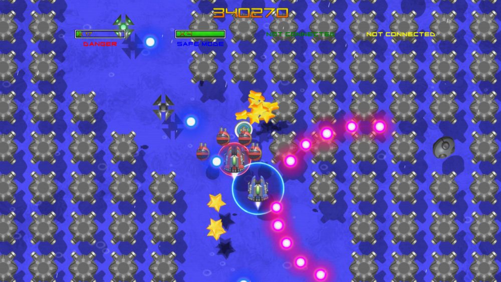 Co-op in Overdriven Reloaded perfectly emulates the feeling of standing in an arcade with friends and pockets full of quarters. Up to four local players can join in at any time by pressing enter/start on the keyboard or gamepad. There's no friendly fire, but power-ups aren't on a per-user basis, so you'll have to share. Players can drop in or out at anytime, and the game doesn't seem to change the frequency or strength of enemies depending on how many people play. That means two people will have an easier time, four will practically burn through foes like leaves in a bonfire.