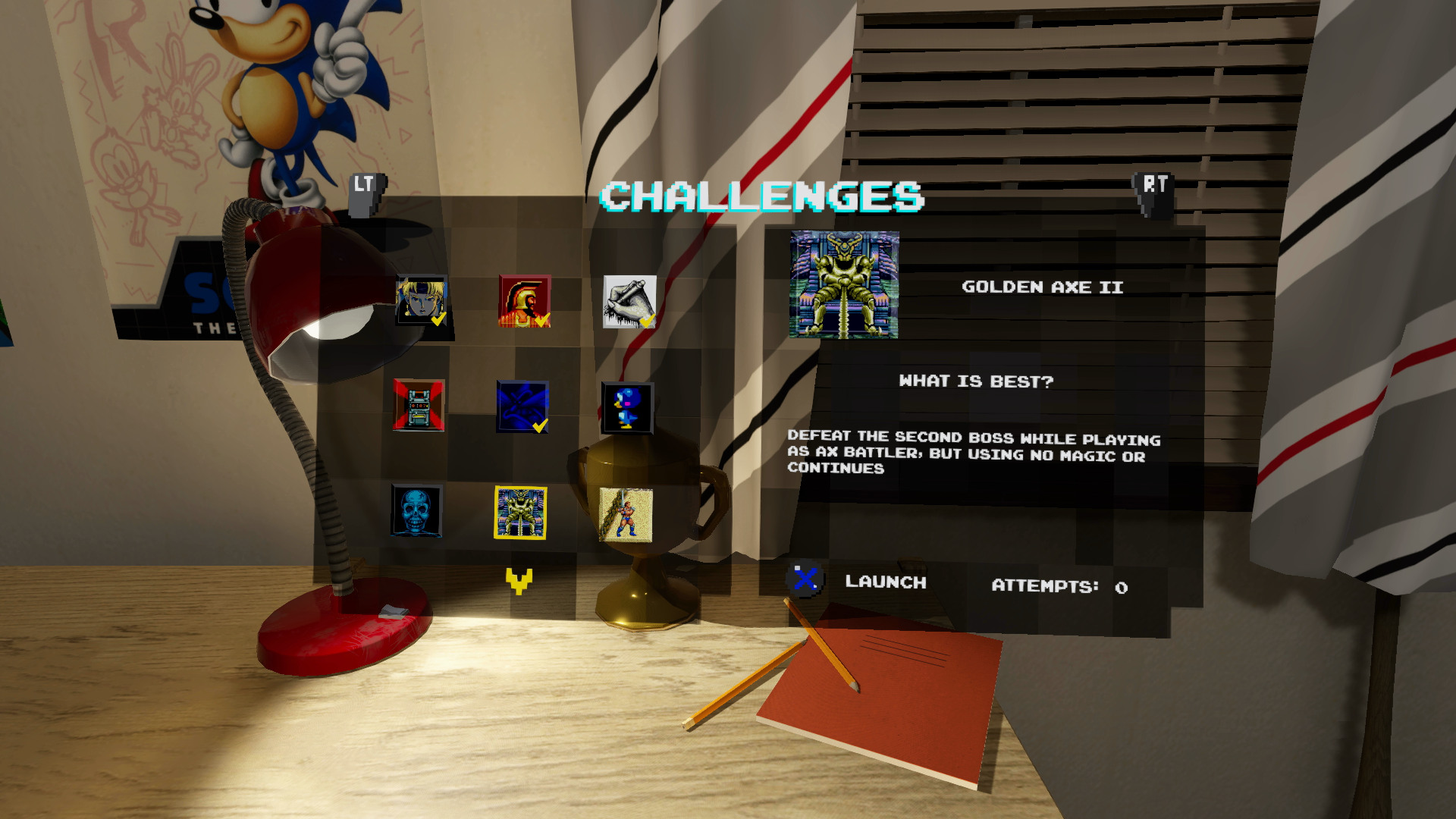 The collection’s 3D front end consists of a bedroom filled with Sega memorabilia, a console and TV, and a shelf full of Genesis games. From there, you can adjust a variety of settings, browse the games library, visit the games menu, and hop into online multiplayer. The interface looks great and is fairly easy to navigate.