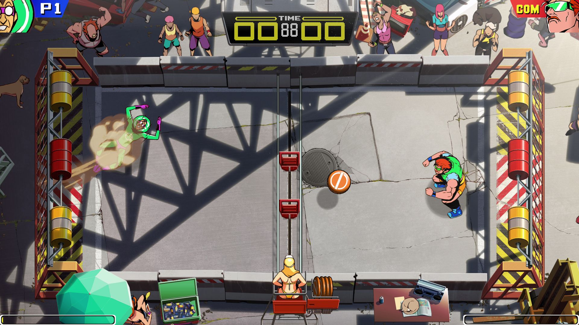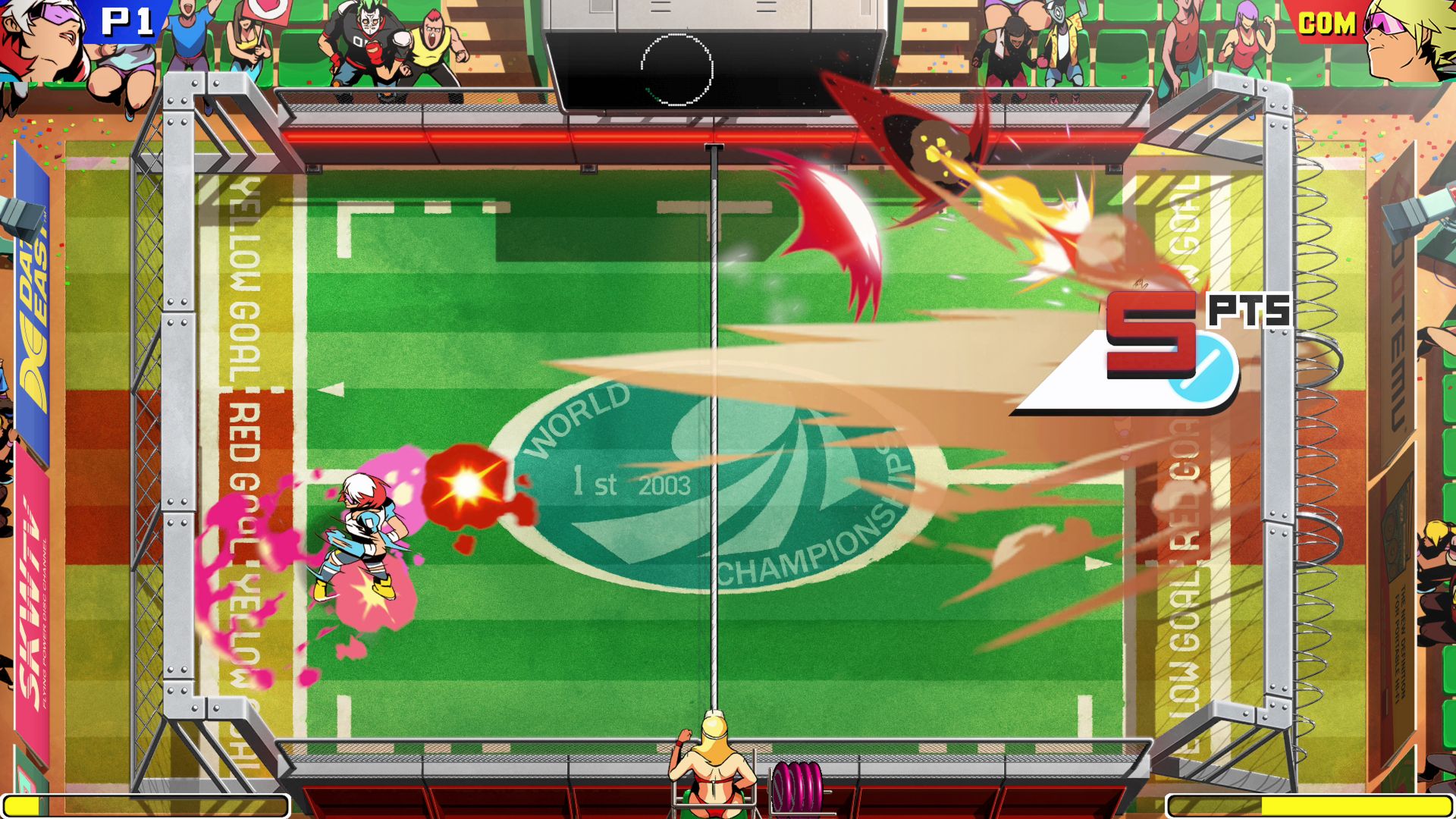 The core gameplay is simple enough to learn – catch the disc, throw it into the opposing side’s goal, and occasionally charge up a powerful super shot. Windjammers 2 uses three buttons for regular shots (up from the first game’s two) and adds the ability to jump. Jumping is an advanced mechanic that mostly comes into play when receiving lobs. Learning the ins and outs of the game would be a lot easier with a dedicated training mode. There’s a “How to Play” section which briefly explains the various mechanics, but interactive tutorials would be so much more effective.
