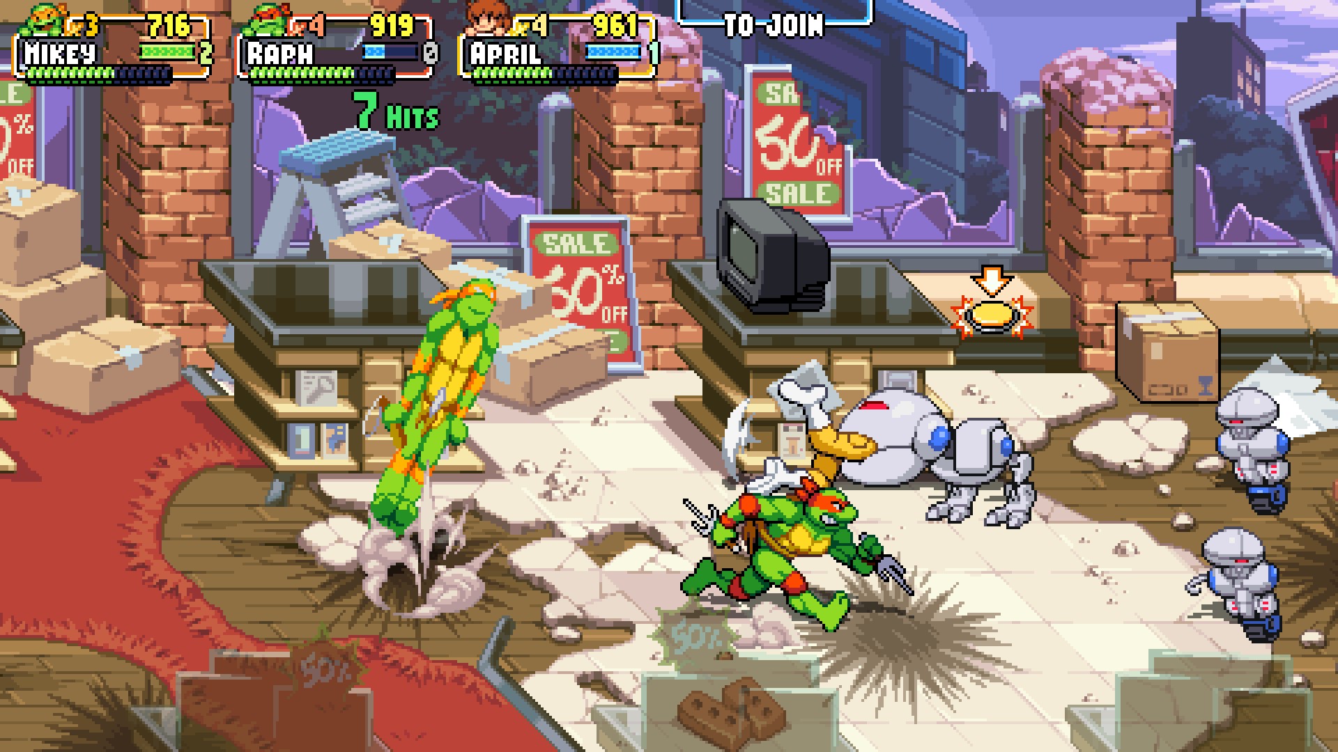 Also enjoyable is the improved grapple system. In Turtles in Time, players could sometimes throw staggered Foot soldiers, but it basically happened at random. Now, simply pressing toward a nearby Foot soldier will grab him. From there, players can left or right plus attack to throw the Foot horizontally, damaging nearby enemies; up plus attack to perform a fling slam, or down plus attack to throw the Foot toward the screen. This arsenal of throws is a lot of fun, though it can be tough to successfully grab enemies during chaotic multiplayer games. Non-Foot soldiers can’t be grabbed, either, but probably 80 percent of enemies are Foot soldiers, so that’s not much of an issue.