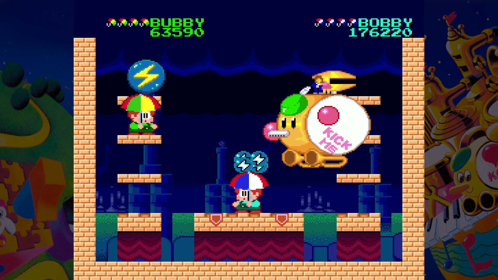 The key difference from Bubble Bobble is that Bub and Bob fight enemies with parasols rather than bubbles. The parasol can be aimed and swung forward or upward, stunning any enemies it touches. Holding the attack button will allow the player to pick up a stunned enemy. The foe can then be thrown forward, damaging any enemies it strikes along the way. Holding the parasol out allows it to act as a shield since only large enemies and bosses can pass through it. Players can also jump and hold the parasol upward in order to float through the air, though the technique is seldom needed other than to unlock an Achievement.