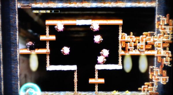 The game play is tight and well controlled. Enemies are colorful and the art style is sharp. Each level is a single screen 'challenge room' with a set number of enemies, barriers and power-ups. These power-ups take the form of gold bars, which have a three-fold purpose. They heal you, add to your score, and once you collect ten in a row you get extra grenades for a timed Mega-Nade Cascade.