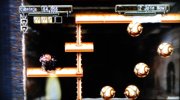As for the co-op, it's pretty standard drop-in drop-out local play. Just push the 'A' button and you're in as the second player. If one player dies then he can push the X button and jump back in, at the cost of half of his buddy's life. Choose and pay. When playing with two players I did not notice any scaling, so the enemy count stayed the same. One gripe I have is that there is very little difference in color schemes for the mechs, so it can be hard to tell which one you are when the action gets hot.
