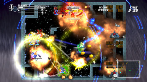 Yet while the levels become more fun, and easier, when playing co-operatively, you can only play those levels that the host has unlocked in their single-player game. Work together to beat something, but don’t get any credit for it. It's a methodology that's annoying when it comes to games like Fable II, but it's practically unthinkable in a game like this one. The reason for this is no doubt tied to the online leaderboard keeping track of everyone's scores and clear times, but I would think that it'd be possible to just disable this feature in order to allow friends, strangers, and 'shmup enthusiasts to team up together to advance through the plethora of stages. Finally, the level editor, where you can take any of the levels you’ve cleared in single-player and modify them to increase the insanity, can only be shared with friends but can only be edited solo. It's a sadly missed opportunity to allow co-operative level editing given that only your friends benefit, or suffer, from your particular brand of 'shmup ingenuity/cruelity.